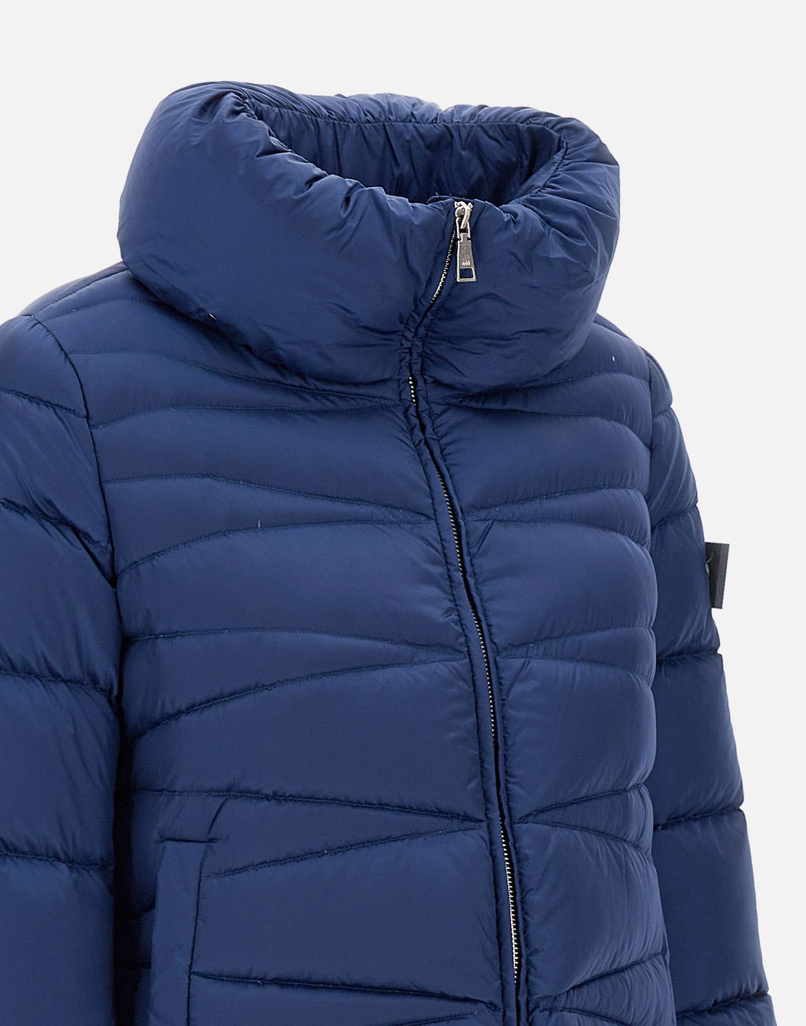 Piumino donna ADD "Lady Down Jacket ", colore blu navy cangiante, collo alto, chiusura frontale con zip a doppio cursore, fondo con coulisse regolabile, due tasche laterali con bottone automatico a scomparsa, polsini elasticati removibili in maglia a costine misto lana , patch logo sulla manica sinistra removibile con bottoni automatici, bretelle con logo add® all'interno del capo, una tasca interna, tessuto idrorepellente, antivento, confortevole, regular fit.