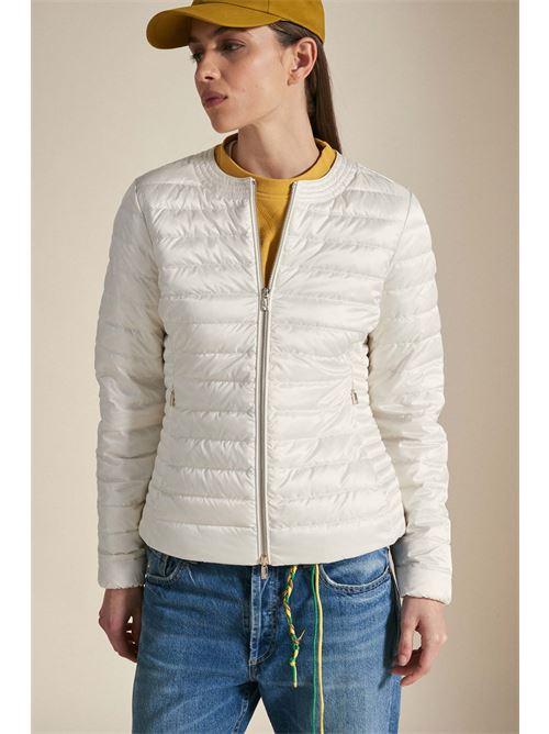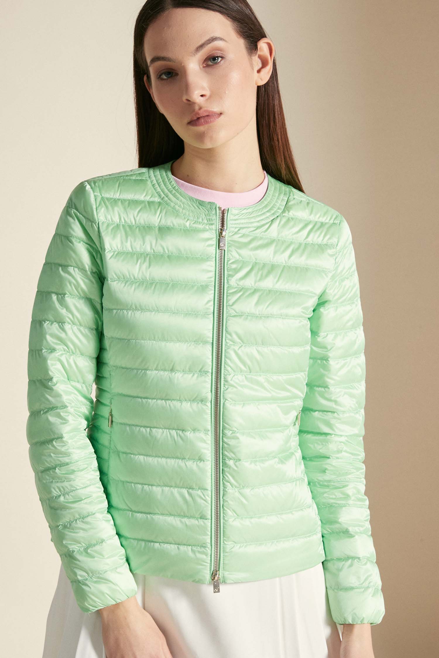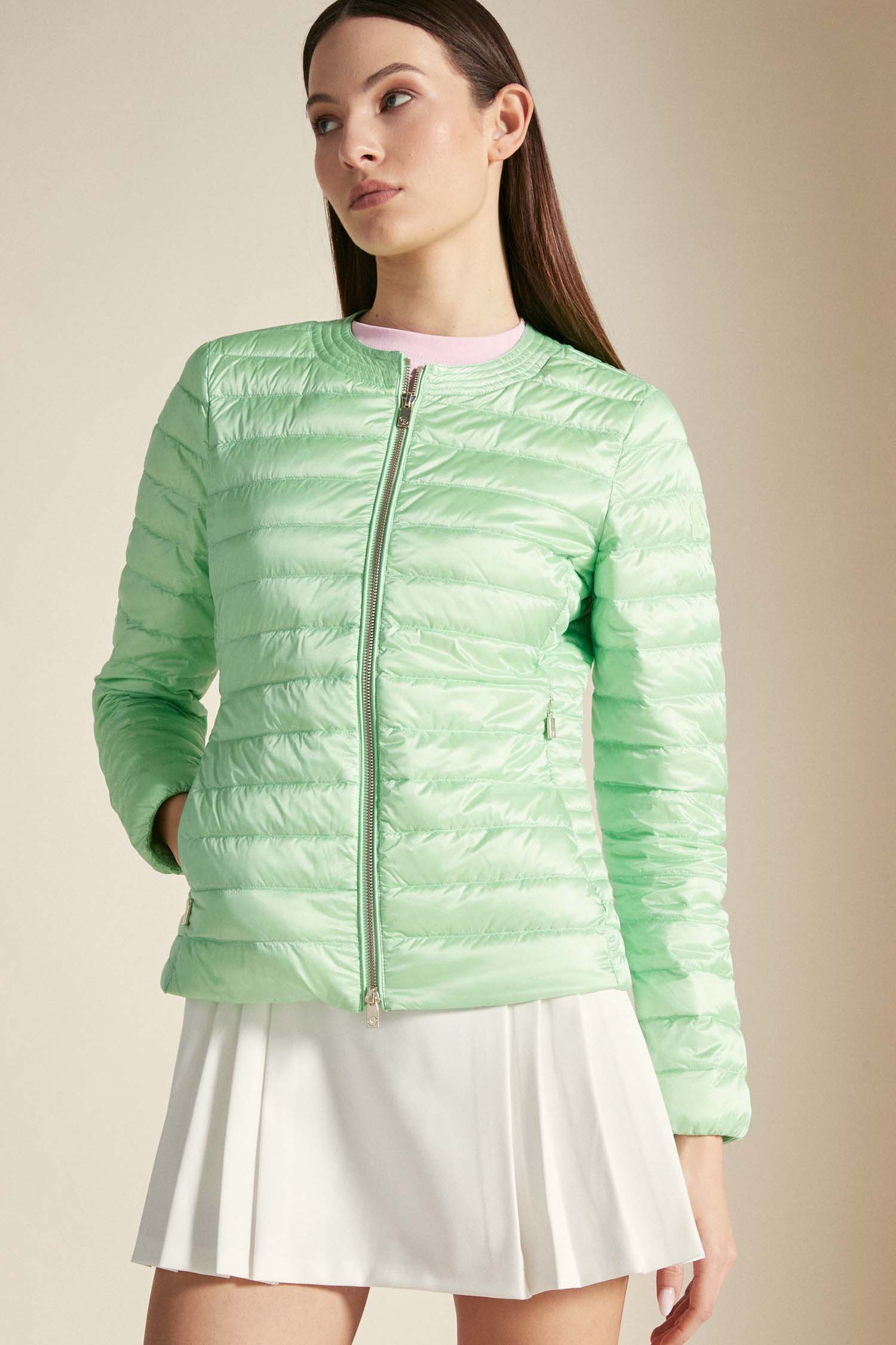 GRACE - Piumino verde pastello full zip realizzato in tessuto leggero nylon cal e caratterizzato da imbottitura in vera piuma naturale certificata 800 fill power. Il piumino ha una vestibilità regolare, ed è caratterizzato da chiusura con doppio cursore e zip in metallo oro chiaro, logo in tono, ampie tasche con zip invisibili e colletto ampio modello Chanel. Il Grace è un best seller Ciesse Piumini ed è proposto in diverse tonalità per la stagione Primavera/Estate.