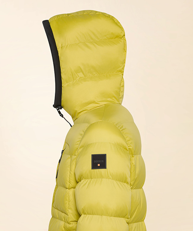 Un piumino in nylon 20 denari, dal peso di soli 40 grammi. Imbottitura in finta piuma ad iniezione diretta per garantire un elevato isolamento termico pur mantenendo la leggerezza. Zip centrale su tutta la lunghezza, cappuccio fisso e tasche laterali con bottoni a pressione. Tasca sul petto con cerniera e dettagli a zigzag arancioni. Colletto bordato in nastro con polsini neri elasticizzati. Questo piumino basic e funzionale rivela tutto il suo stile sportswear metropolitano e dinamico, perfetto con i tuoi outfit di tutti i giorni. Stemma DEKKER sulla manica sinistra.