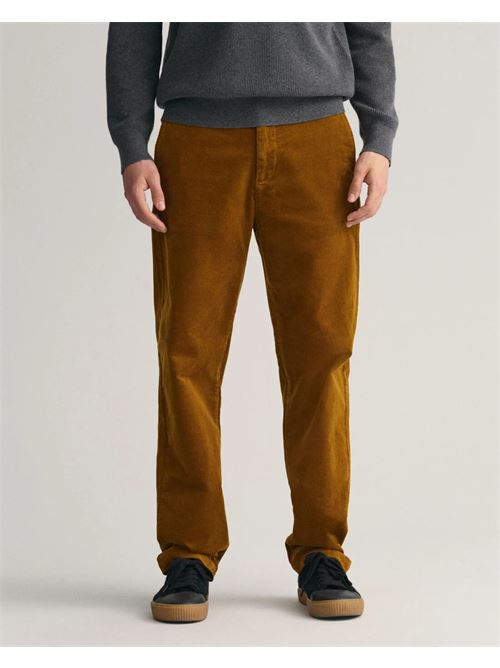 Questi pantaloni chino in twill di cotone biologico con un tocco di elasticità presentano una vestibilità slim sui fianchi fino alla gamba. Sono rifiniti dalle tasche posteriori con bottoni e logo GANT sulla tasca posteriore destra. Abbinali a qualsiasi capo, da una T-shirt dal taglio rilassato a una camicia button-down più elegante.