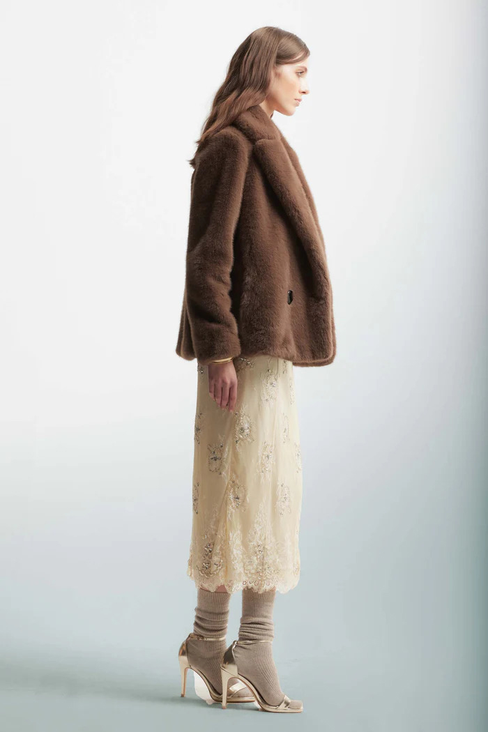 Cappotto corto realizzato in morbida pelliccia, con abbottonatura doppiopetto sul davanti. Caldo ed essenziale per un look impeccabile.