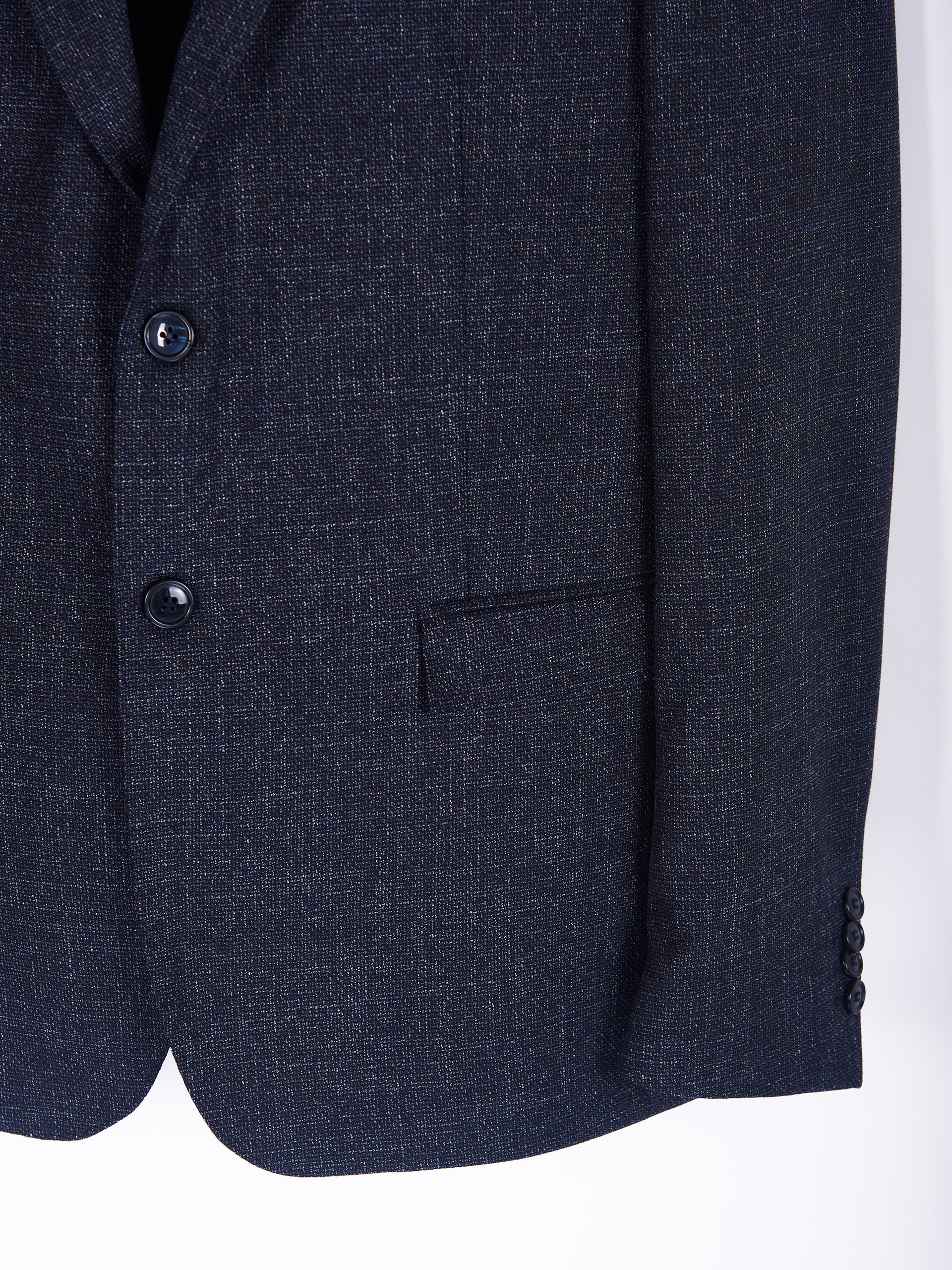 Abito classico, realizzato con tessuto effetto melange. Giacca due bottoni, collo con revers classici. Pantaloni slim-fit.
