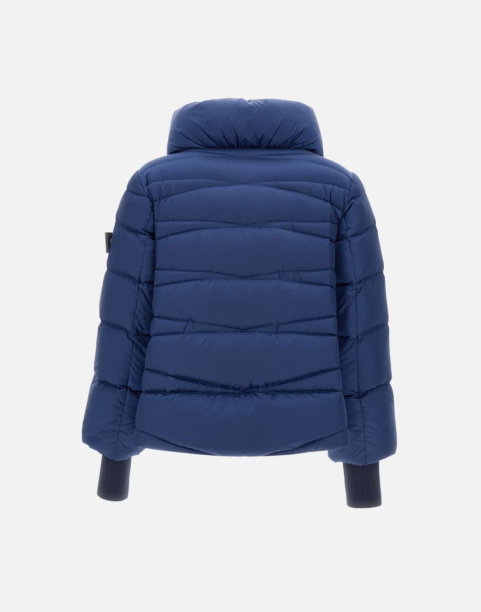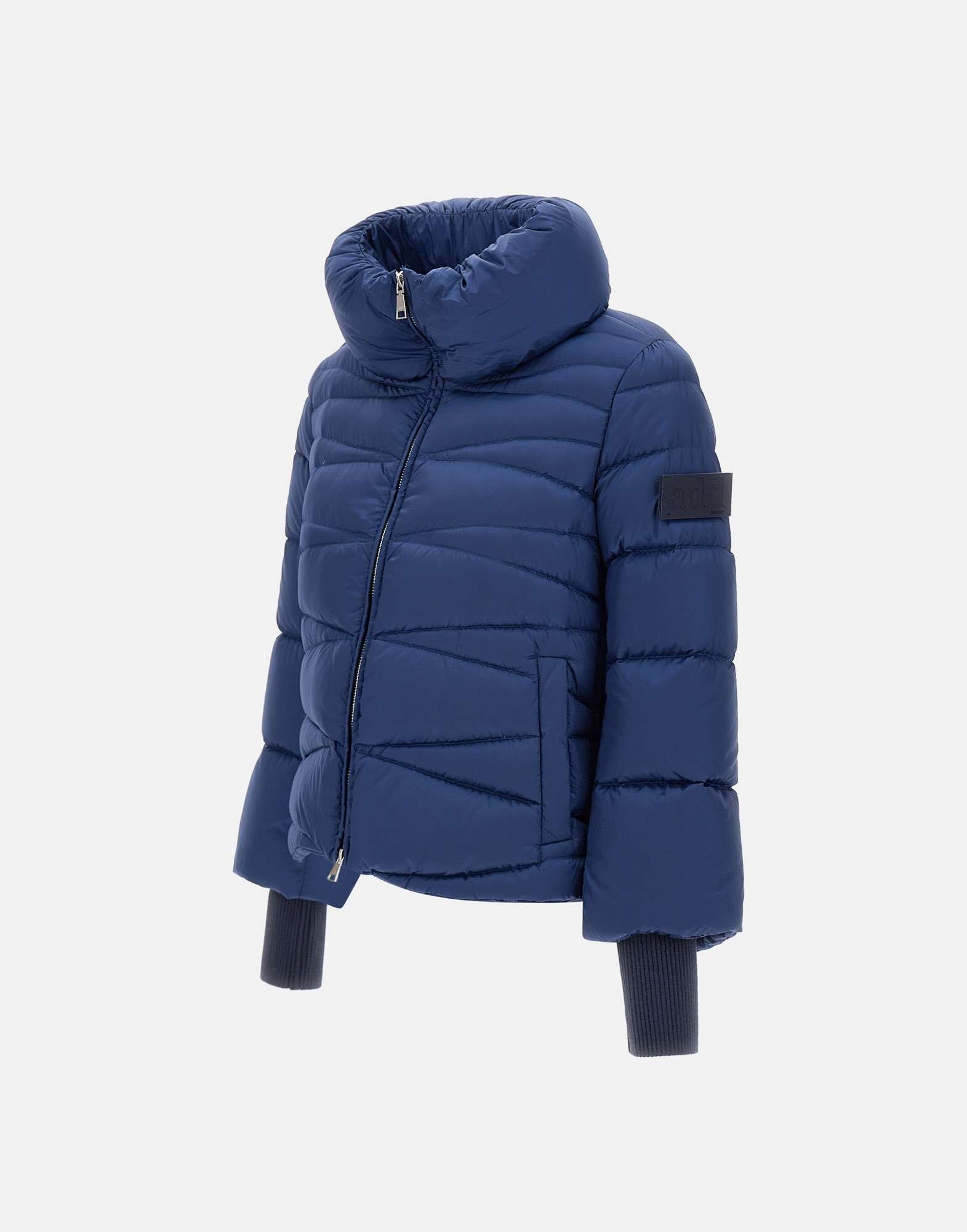 Piumino donna ADD "Lady Down Jacket ", colore blu navy cangiante, collo alto, chiusura frontale con zip a doppio cursore, fondo con coulisse regolabile, due tasche laterali con bottone automatico a scomparsa, polsini elasticati removibili in maglia a costine misto lana , patch logo sulla manica sinistra removibile con bottoni automatici, bretelle con logo add® all'interno del capo, una tasca interna, tessuto idrorepellente, antivento, confortevole, regular fit.